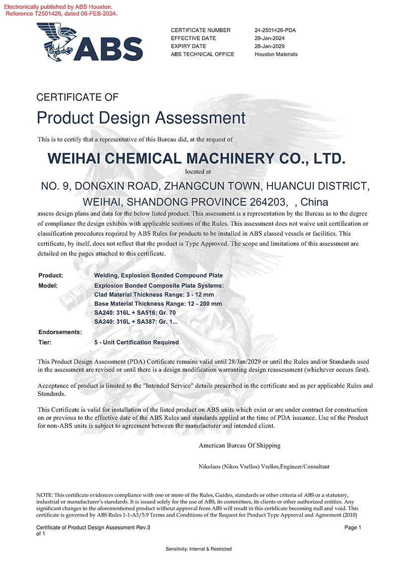 2024/04/17 查看詳情近日,威?;瘷C(jī)順利獲得美國船級社(ABS)頒發(fā)的產(chǎn)品設(shè)計PDA認(rèn)可證書,認(rèn)可產(chǎn)品名稱為“爆炸焊接復(fù)合板”,涵蓋產(chǎn)品種類:ASME SA264、ASME SA265、ASTM B898標(biāo)準(zhǔn)…